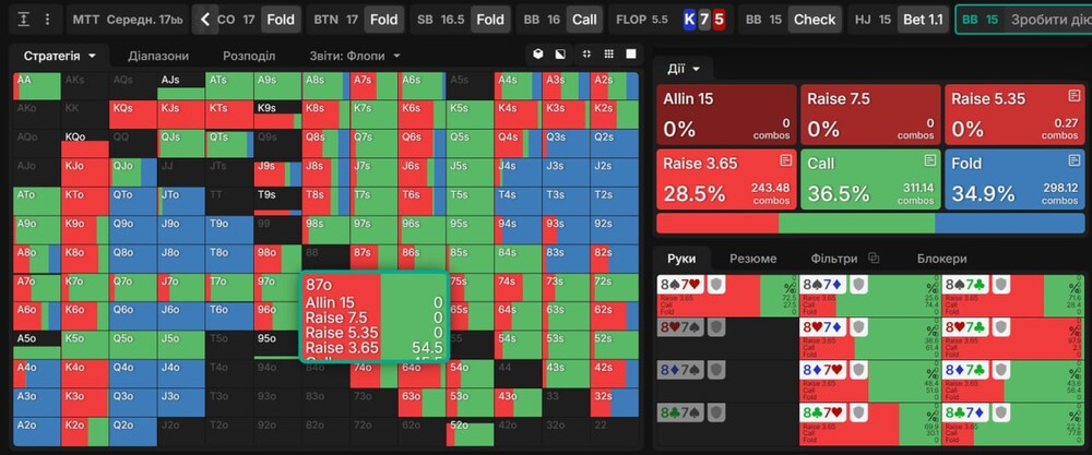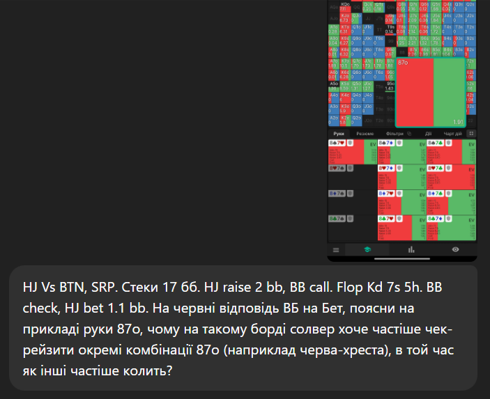 Але солвер хоче грати саме 8♥️7♣️ через чек-рейз майже у 100%, а інші варіанти з іншими мастями — частіше через кол. Чому??? Це ж блін одна і та сама комбінація!