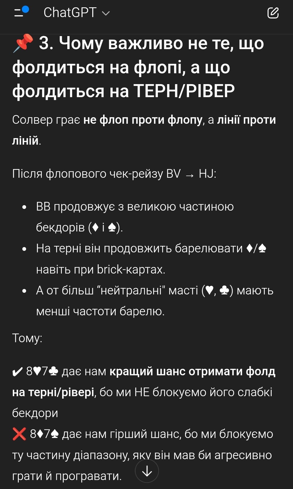 Без глибокого пояснення від ШІ це виглядало б як «солвер так хоче — значить так треба, запам’ятаю». З поясненням це перетворюється на правило, яке можна застосовувати і на інших флопах з іншими руками.