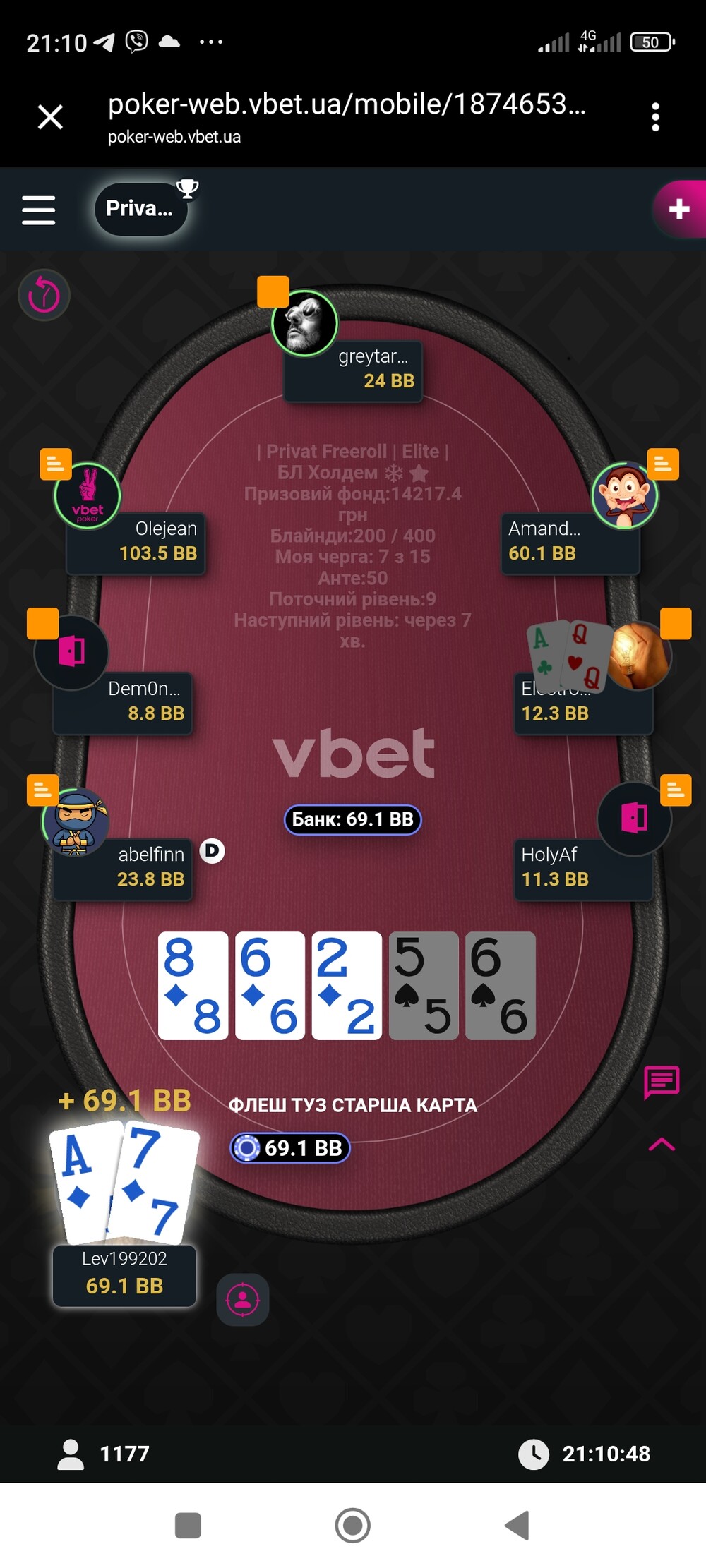 А далі через 7 хвилин і сталась ця цікава роздача проти Електроаірмена, і так як вона проходила: префлоп він рейз 2 чи 3вб, я кол, по флопу в мене натс, він бет 3.5 вб, я кол, тьорном виходить 5 яка нічого не змінює і він бет 7 вб, я знову кол. Рівером вже вийшла 6 яка спарила дошку і опонент нажимає чек, ну тут я ставлю оллін приблизно 20 вб, і Електрик нажимає кол...