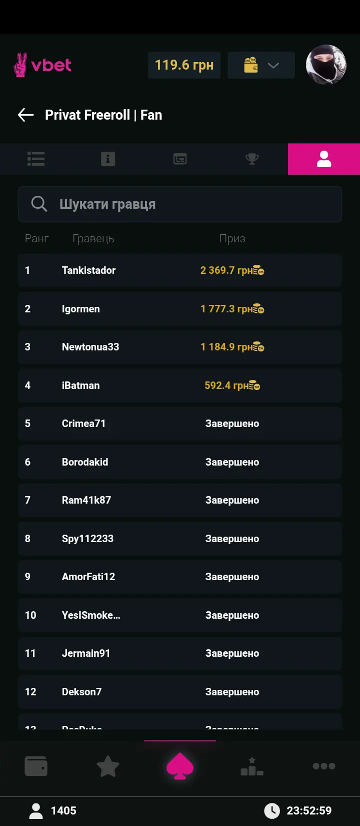 Це був найнудніший турнір який я грав!!!Всі грали жахливо прагматично,нуль імпровізації,нуль блефів - нуль емоцій.Тільки АйБетмен трохи фарб додавав,на втіху.