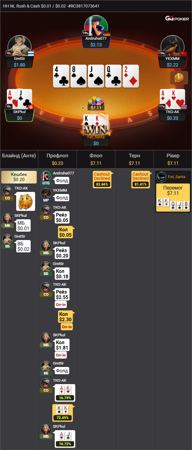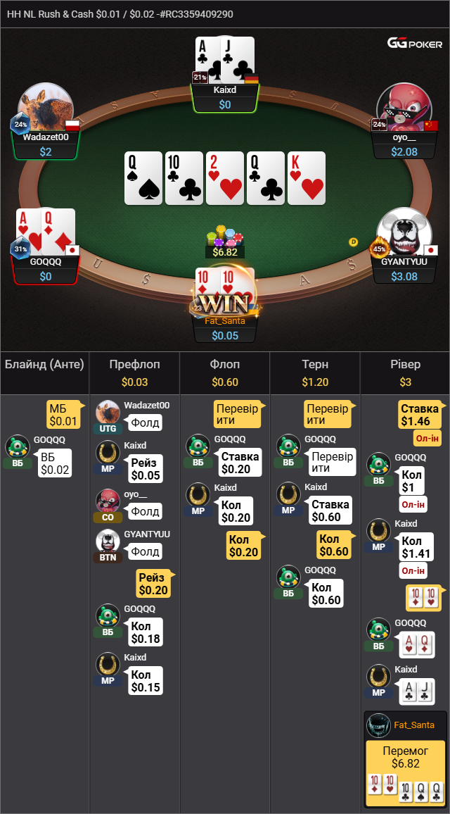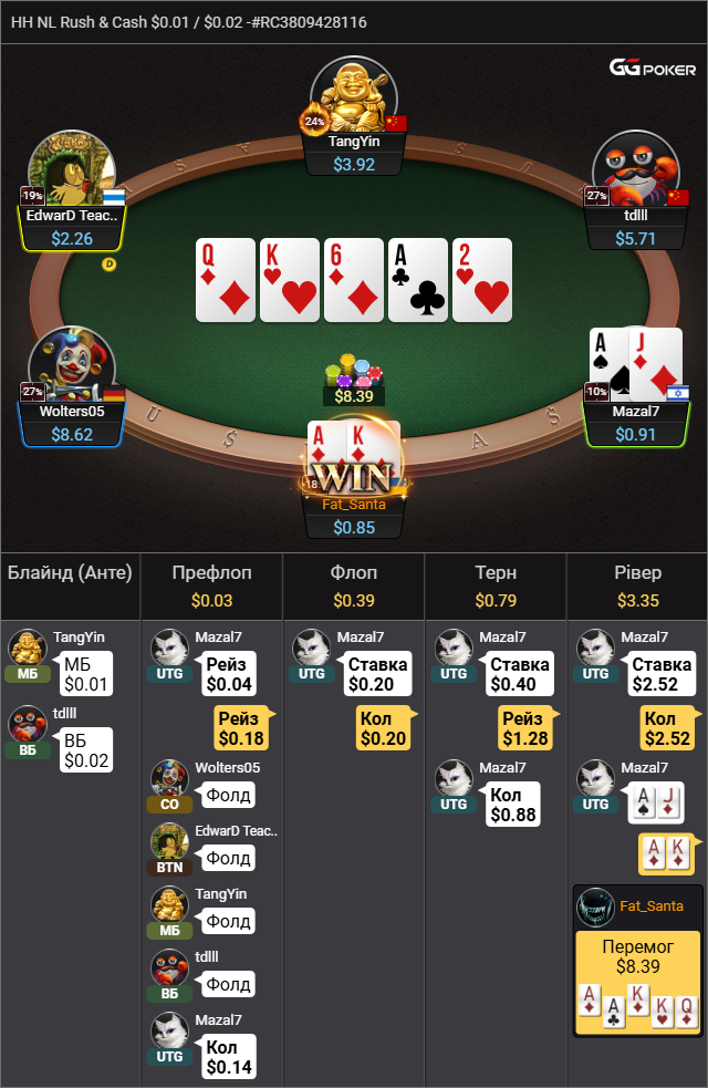ПРИКЛАД Ⅱ Золотий стіл(де ще кидається додатковим 10вв, 20вв до банку, або по 100вв кожному гравцеві.Оскільки спортсмени тут часто лудять, та постійно намагаються з мусорними руками забрати банк я люблю тут послоуплеїти сильні руки. Підколив КК, а далі понеслась двіжуха, надиво руки в опонентів були ще адекватні.