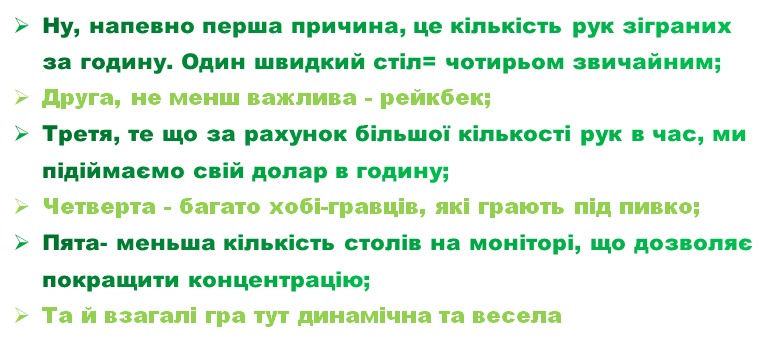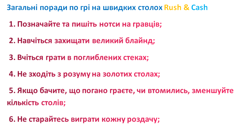 Я б може ще додав, що якщо ви хочете грати в кеш, то треба грати мінімум з повним стеком і постійно докупатися до нього! Пам'ятаю колись чув таку пораду!