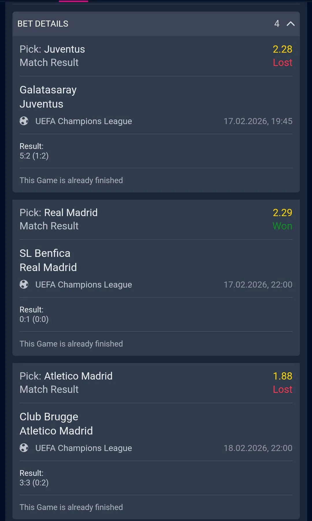 Щоб відволіктися від невдач в покері, вирішив зробити декілька ставок в турнірах ЛЧ та ЛЄ. Останній раз займався цією справою років 3 тому не менше. Можливо я б і не робив цього, але зайшов до кардмейтс, побачив прогнози інших блогерів, загорівся бажанням . Ось що з цього вийшло.