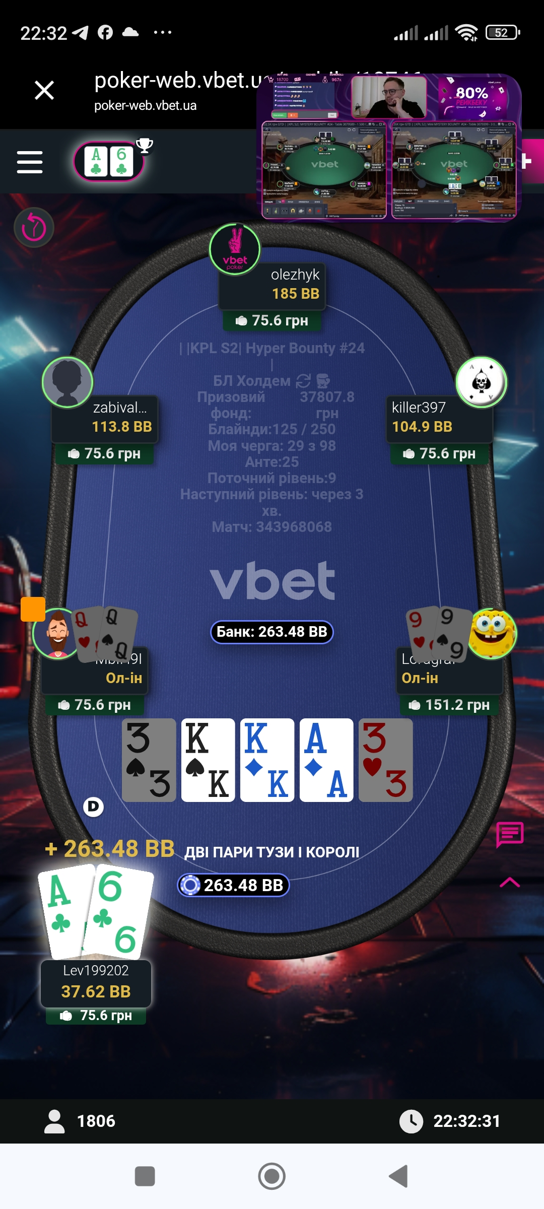 І так почнемо з четверга і стрімерського турніра на GG, і хоть цього разу за своїм столом я бачив не одного стрімера, та карта моя не давала змоги зробити жодного нока🥲 практично завжди пас задніх, але одного разу вдалось подвоїтись проти нашого Санти